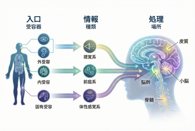 固有受容覚は「入口のセンサー(受容器)の種類」の話です。